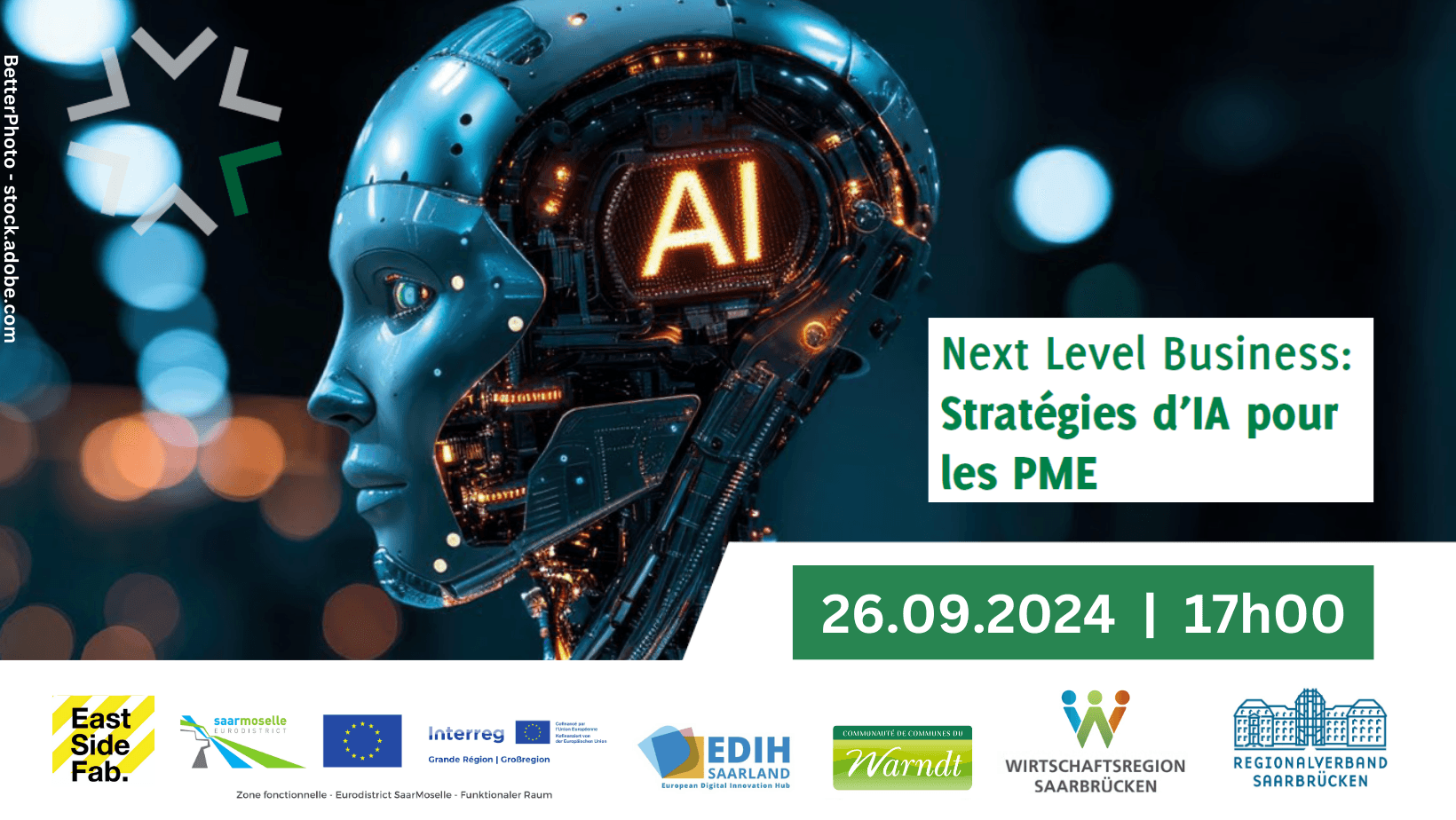 Sous le slogan „Next Level Business : Stratégies d'IA pour les PME“, nous souhaitons réunir des entreprises de la Grande Région et favoriser les échanges ainsi que la mise en réseau par-delà la frontière franco-allemande.